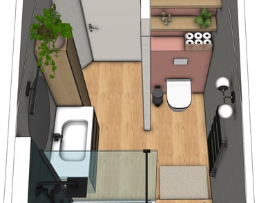 Sol imitation bois (spécial pièces humides) et meubles en bois pour réchauffer l’atmosphère.
