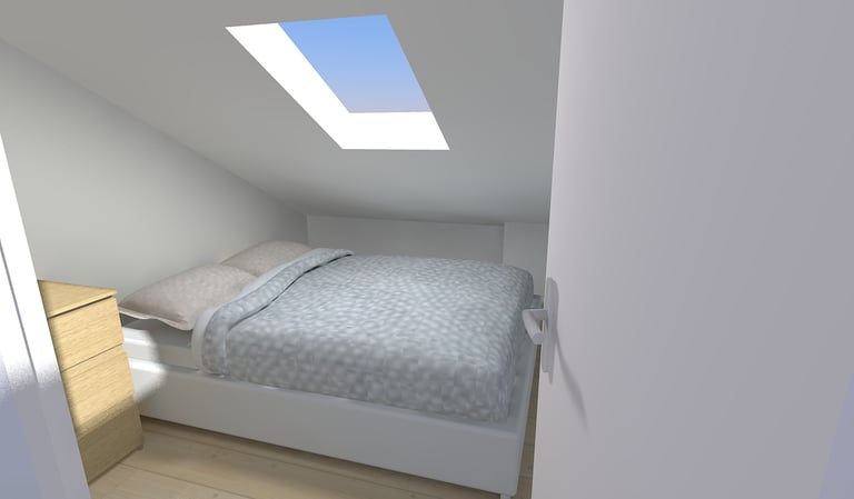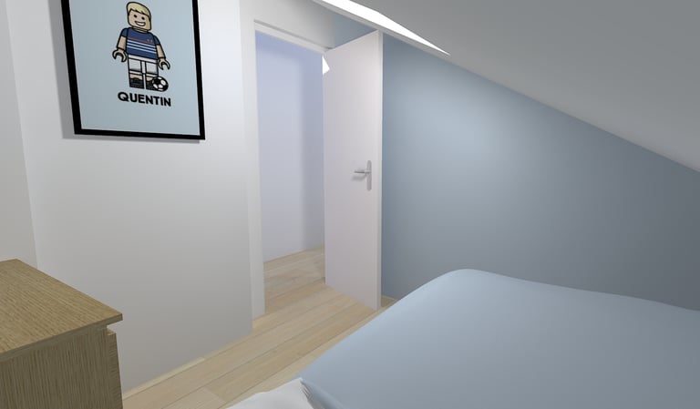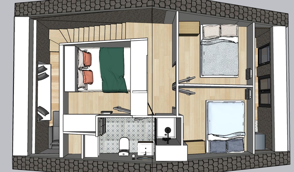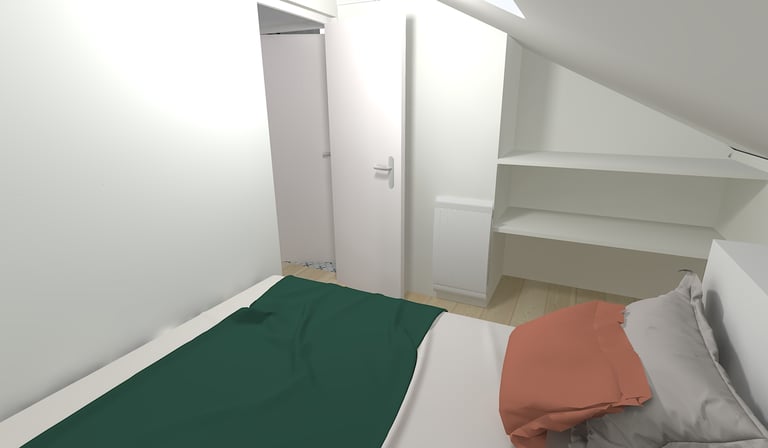 - Au deuxième étage : trois chambres et une salle d’eau, aménagées sous combles. Les chambres sont compactes mais fonctionnelles, compensées par l’espace convivial du niveau inférieur.