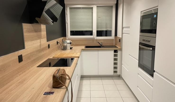 - Palette : une base blanche lumineuse, réchauffée par un plan de travail bois, relevée de touches noires pour le côté chic et intemporel.